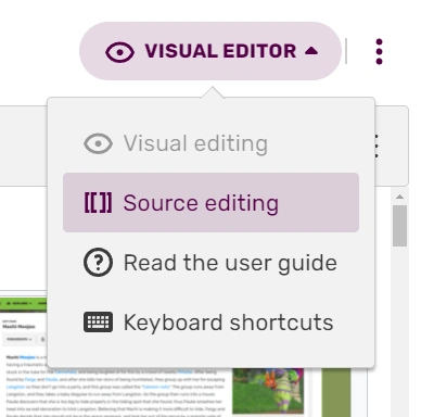 - Muokkaimen vaihtaminen lähdekooditilaan voi viedä muutaman hetken, koska se vaatii muokkaimen sisällön palauttamista wikitekstiksi.