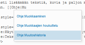 Lähdekooditilassa muokattaessa linkkiehdotusominaisuus ehdottaa olemassaolevien sivujen ja tiedostojen nimiä syötetyn tekstin perusteella. Tämä voi olla avuksi mikäli et tarkalleen muista linkitettävän sivun nimeä.