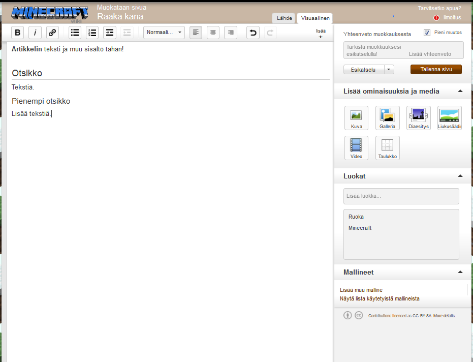 - Kirjoita yhteenvetolaatikkoon pieni kuvaus tekemistäsi muutoksista, niin Tuoreiden muutoksien ja muutoshistorian selaaminen helpottuu.