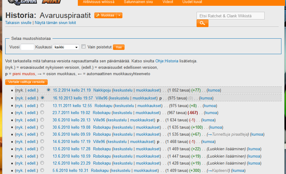 - (edell.) vie sinut muutossivulle, joka näyttää erot sen ja edellisen version välillä. Alla näkyy sivu sellaisena, jolta se muutoksien jälkeen silloin näytti.
