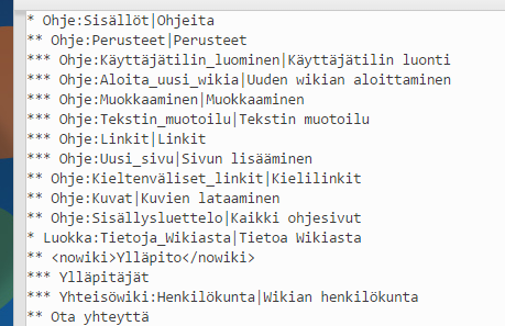 - Sinun on käytettävä wikitekstiä lisätäksesi valikkoon linkkejä ja muokataksesi niitä. Asteriskien ("*") määrä edustaa linkin tasoa: