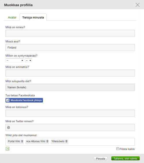 - Kaikki mitä laitat profiilisi yläosaan näkyy kaikissa wikeissä, joita olet muokannut. Esittele itsesi siis niin, että se sopii kaikkiin yhteisöihisi.