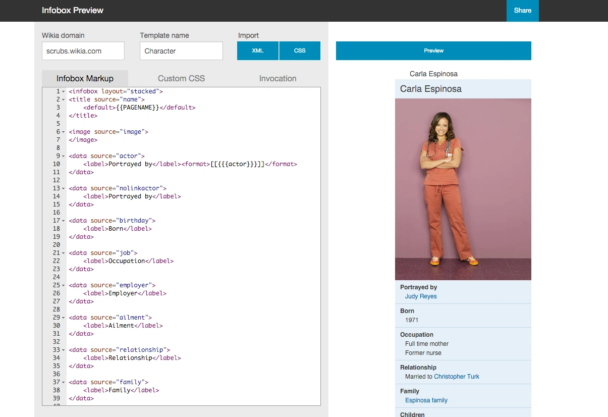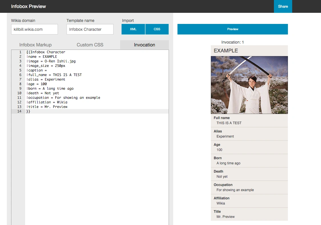 Joka kerta kun klikkaat "Esikatselu"-painiketta, työkalu tutkii kommentit kaikista kolmesta välilehdestä — Infobox Markup, Custom CSS, ja Invocation — yhteisön URL-osoitteen sekä mallineen nimen näyttääkseen esikatselun. Se selvittää, missä yhteisösi sivuissa malline on jo käytössä ja näyttää 10 esimerkkiä siitä miten malline näyttää minkä tahansa käyttämäsi koodin.