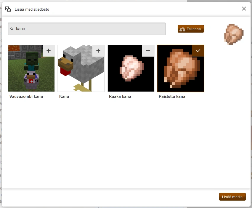 - Hae kuvia ja videoita yhteisöön jo ladatuista tiedostoista syöttämällä hakusanoja työkalun yläreunan kenttään. Kentän alapuolelle ilmestyvissä tuloksissa voi olla sekä kuvia että videoita. Napsauta yhtä tai useampaa tiedostoa lisätäksesi ne koriin. Lisättyjen tiedostojen oikeaan yläkulmaan ilmestyy ruksi (näkyy myös myöhemmissä hakutuloksissa).